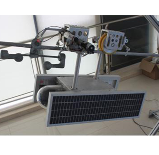 →输电线路除障机器人 输电线路除障机器人是以移动机器人为载体,携带摄像头和喷火装置,沿架空输电线运动,对线路进行检测、清障等作业。