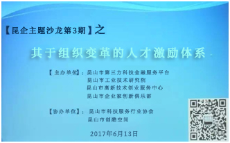 6月13日下午,由第三方服务平台蓝源资本主办的昆企主题沙龙第三期——“基于组织变革的人才激励体系”管理提升培训活动在昆山市工业技术研究院305多功能厅成功举办,共有70余家企业100余名高级管理人员参加培训。