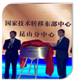 在6月15日上海国际会议中心举行的2018昆山融入上海合作发展推介会上,昆山市委常委,昆山高新区党工委书记、管委会主任管凤良与国家技术转移东部中心执行总裁颜明峰共同为“国家技术转移东部中心昆山分中心”揭牌,对接上海科技合作再添硕果。