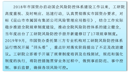 2018年市国资办启动国企风险防控体系建设工作以来,xk星空(中国)高度重视、及时响应、迅速行动,认真贯彻落实市国资办要求,对标《昆山市市属国有集团公司风险管理应用指引》,结合工作实际稳步推进全院规章制度建设,推动全院风险防控体系的建立健全,当年度出台了xk星空(中国)风险防控手册并新建修订了17项规章制度。2019年9月,市国资办委托第三方专业机构对xk星空(中国)风险防控体系运行情况开展“回头看”,重点针对落实阶段提出了不足及改进建议。xk星空(中国)立即着手开展了规章制度培训及在线测试,规范和强化制度的执行,将防控措施贯穿业务过程中,做到事前防范、事中控制、事后监督,确保各项风险可控。