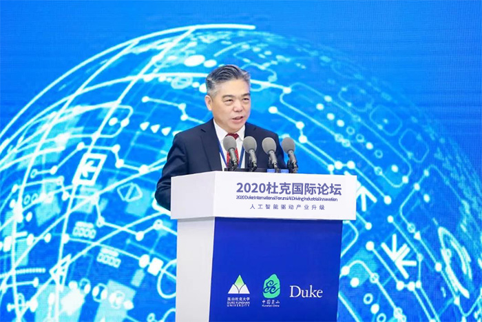 12月4日,2020杜克国际论坛在昆山杜克大学举行。本届论坛以“人工智能驱动产业升级”为主题,中国投资有限责任公司原副董事长高西庆,联想集团首席技术官、高级副总裁、欧洲科学院外籍院士芮勇等企业高管、投资人、创业者和科学家汇聚一堂,探讨人工智能产业发展趋势。美国杜克大学副校长迈克·舍恩菲尔德视频致辞。武汉大学副校长唐其柱,昆山市委副书记、市长周旭东,副市长李晖,昆山杜克大学常务副校长艾尔弗雷德·布鲁姆等出席开幕式。