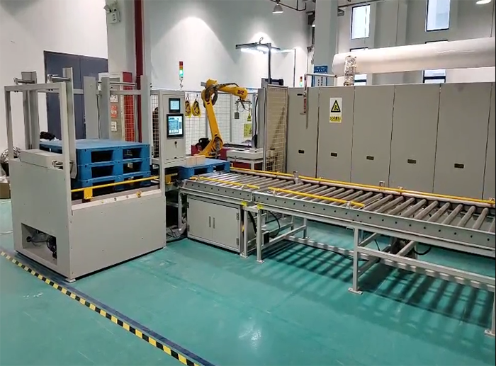4、出料处设计有栈板存储区,可储存4个栈板,栈板自动分离,单个传动,待存满后,人工统一下料,大大节省了人工下料时间。最终可实现整个系统12小时无人化运行。