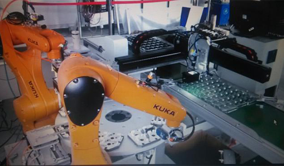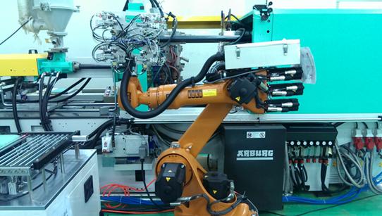 设备采用六自由度机器人配以气动手抓,实现金属Pin埋入注塑机,注塑完成后自动取出产品。该设备实现了三种12个Pin针自动排列并埋入注塑机,实现了注塑产品取出的自动化,配备模具视觉监视系统,保证了设备的可靠性。