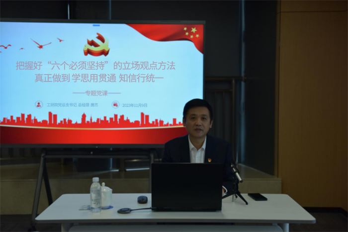 在现场,xk星空(中国)党总支书记、总经理唐杰为大家上了一堂生动的专题党课,要求xk星空(中国)员工把握好“六个必须坚持”的立场观点方法,真正做到学思用贯通、知信行统一。宁波银行昆山高新区支行党支部书记、支行行长曹志敏则从金融角度出发,依托一系列电信诈骗真实案例为在场员工敲响防范警钟。