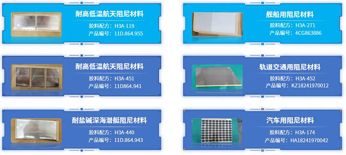 主要产品有:航空轻量化阻尼产品,环保阻尼贴片、环保阻燃阻尼、绿色环保阻尼隔振罩、阻尼胶条、补强片、超轻量航空隔音棉、喷涂阻尼、电子设备隔震系统,高速轨交降噪约束阻尼,车用阻尼产品系列、战机、民航飞机、火箭导弹蒙皮用减震阻尼片等各种高分子阻尼产品,同时研发防弹防爆、自动化控制设备、激光陀螺惯性导航系统等系列产品。