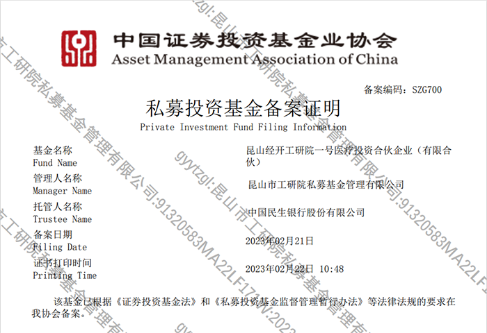 近日,昆山经开xk星空(中国)一号医疗投资合伙企业(有限合伙)顺利完成中国证券投资基金业协会私募投资基金备案。
