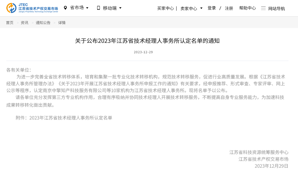 江苏省科技资源统筹服务中心、江苏省技术产权交易市场联合公布了