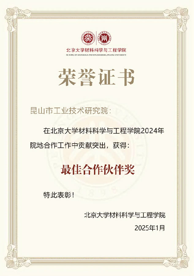 因主动作为、高效对接、高质量推动校企合作并取得丰硕成果,日前,昆山市工业技术研究院荣获北京大学材料科学与工程学院2024年院地合作“最佳合作伙伴奖”。